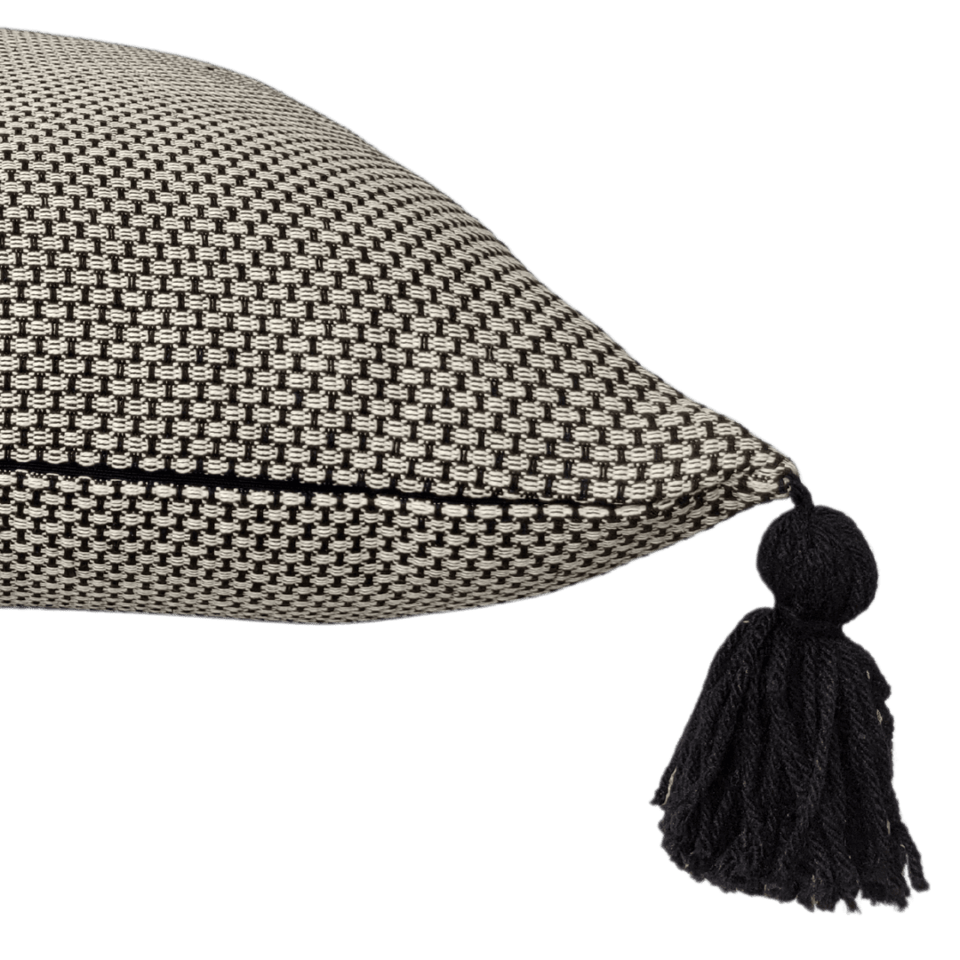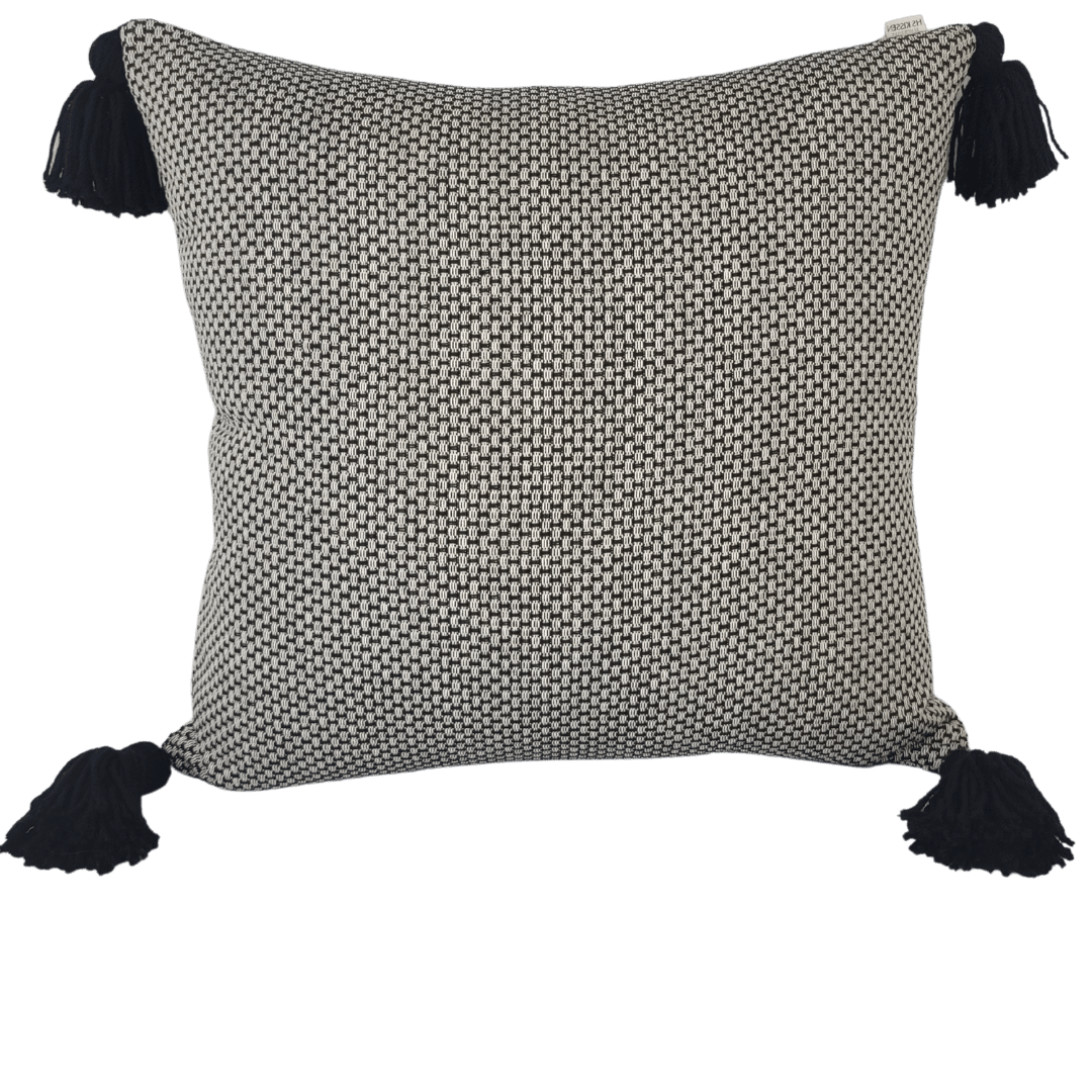 Almofada quadrada em tecido tramado, ornamentada com tassels nos cantos.